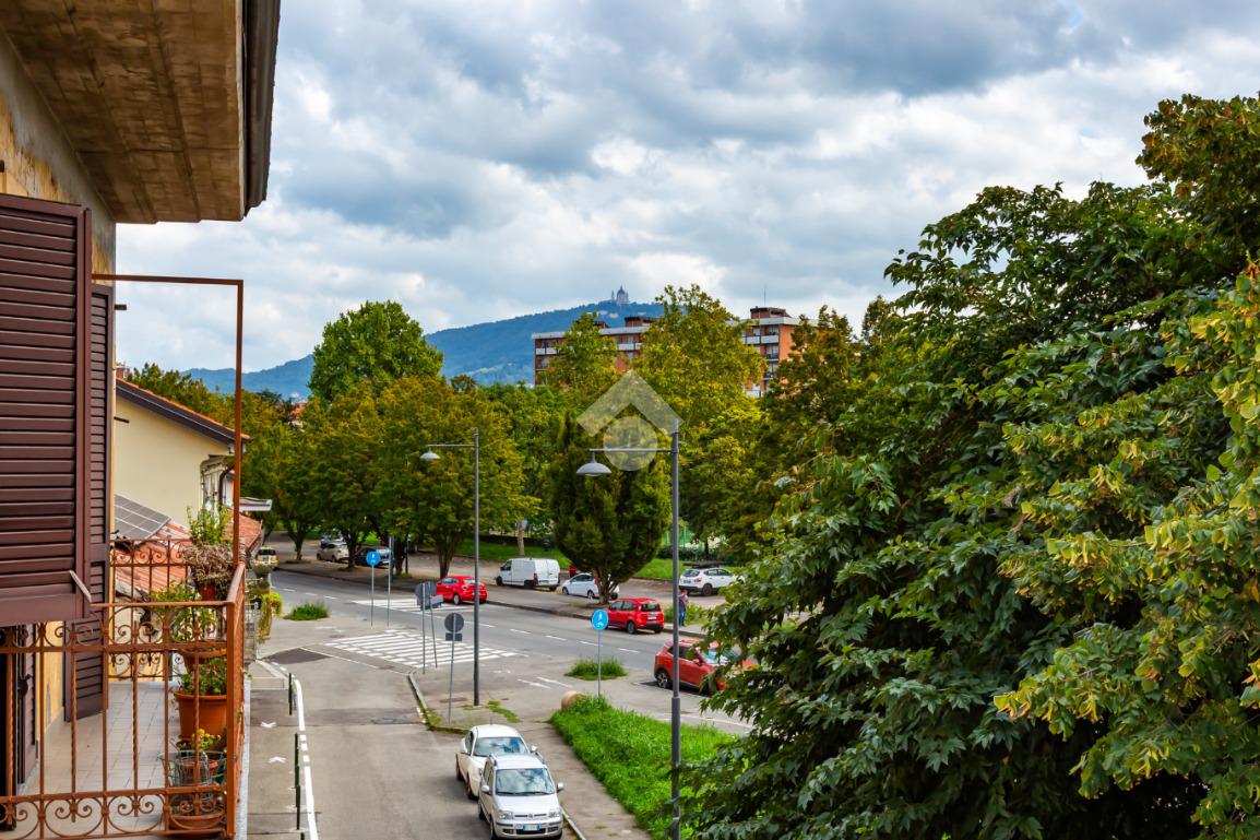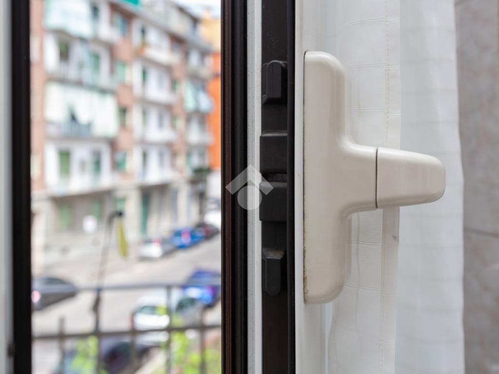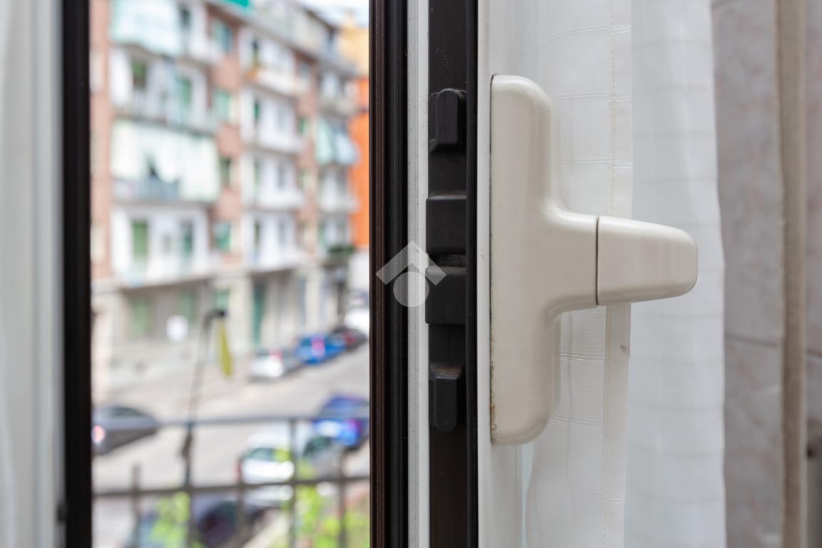 L'ingresso si apre su una luminosa zona giorno con cucina a vista e sala da pranzo, seguita da una camera da letto matrimoniale, una cameretta e un bagno finestrato completo di box doccia e angolo lavanderia. L'immobile gode di una tripla esposizione, con due balconi: uno affacciato su Via Aosta, accessibile sia dalla cucina che dalla camere matrimoniale, e uno interno cortile, collegato alla zona giorno. Il riscaldamento è autonomo.