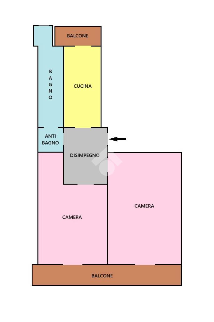 L'appartamento è composto da un ingresso, due camere da letto, cucina abitabile e bagno con antibagno.